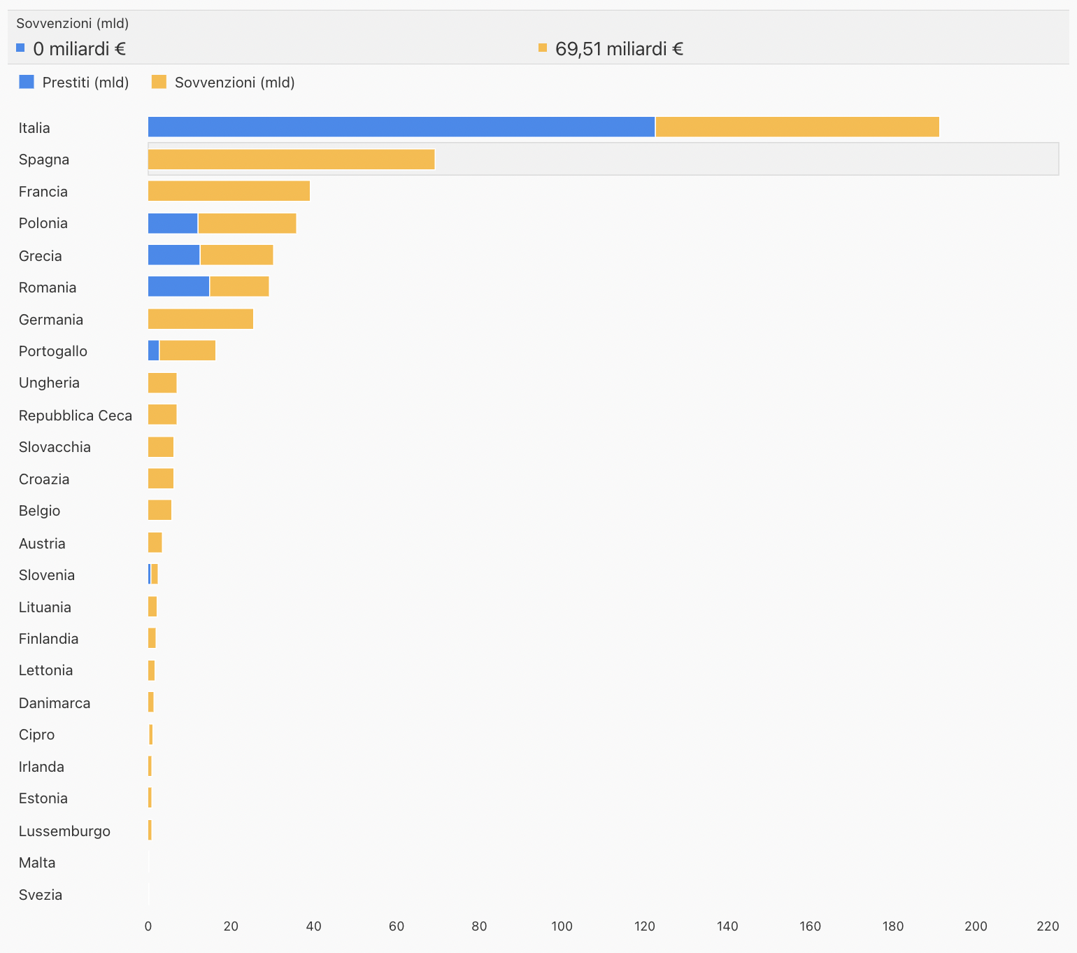 Vediamo quanto hanno preso dall’Europa i vari paesi. In effetti l’Italia ha richiesto, e grazie a Conte ottenuto, nettamente più soldi di tutti. La Spagna, al secondo posto, ha ricevuto circa 1/3 dei soldi del nostro paese. E via via, gli altri paesi europei hanno ricevuto tutti, i soldi di cui avevano bisogno. Però notiamo subito, che ci sono 2 colori, l’arancione: sono soldi a fondo perduto, che praticamente non ci costano nulla. La parte in azzurro invece, rappresenta soldi, che dovremo restituire all’Europa con gli interessi. Se ci fate caso, solo l’Italia e la Romania, hanno più della metà del grafico, in azzurro, e solo altri 3 paesi Polonia, Grecia e Portogallo, hanno parti del grafico azzurre. Gli altri paesi riceveranno, solo soldi a fondo perduto, da poter investire, senza doverli restituire. Malta e Svezia, non hanno richiesto, e non riceveranno nulla. Quasi i 2/3 dei soldi ottenuti, dal genio dell’economia avvocato Conte, aumenteranno il nostro debito estero. E li dovremo pagare noi, tutti noi. Potevamo fare come Spagna, Francia, Germania, Ungheria, e via via gli altri paesi, che riceveranno soldi, tutti a fondo perduto. E poi, conta molto, anche il modo in cui saranno spesi i fondi ricevuti, andrebbero investiti in attività economiche, che creino ricchezza, benessere, e posti di lavoro. La nostra paura è che, come spesso accade, ed è accaduto quasi sempre in passato, saranno utilizzati, per dare mance elettorali oppure finiscano “mangiati dai politici e partiti”, o che siano buttati via, senza ottenere nulla di buono. Le prossime generazioni, pagheranno un conto salato, a causa dei nostri esperti di economia, che non hanno studiato, ma ne capiscono, più di chi è esperto.